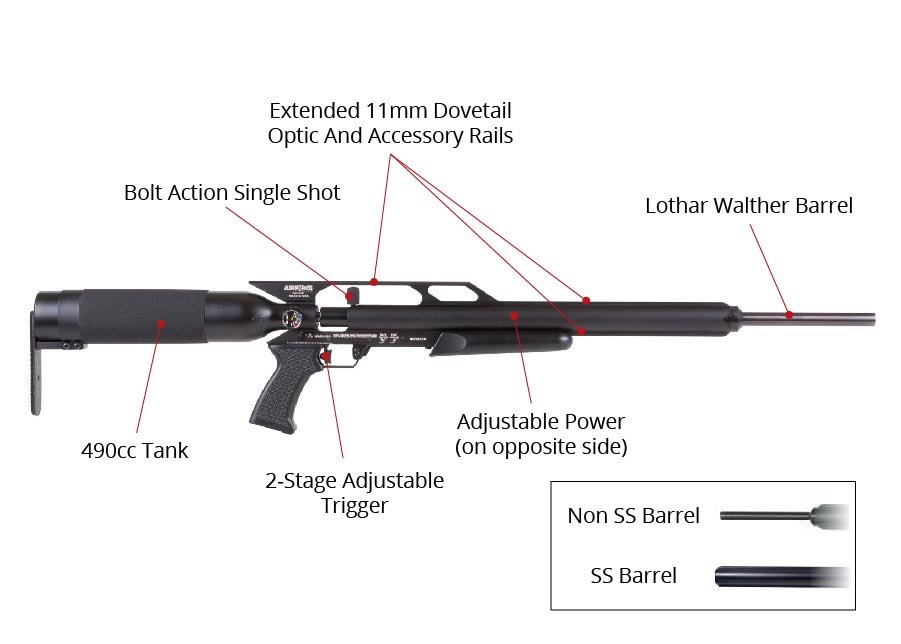 The AirForce Condor delivers from 600 fps to a rip-snorting 1300 fps (in .177)- and it’s recoilless! Accurate (1″ at 50 yards) and powerful- this PCP offers extreme flexibility. It has an 18″ Lothar Walther barrel (1:16 twist). You can also buy 12″ and 24″ barrels. Change-outs are easy and don’t require any special tools- but the gun will be unsilenced. Built in the USA.