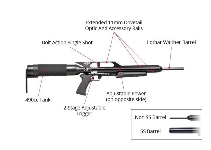 don’t forget to pick up a scope or standard optic sights for this rifle or other AirForce accessories because they are not included with this package. It is also recommended to pick up a gun case and a .177 caliber maintence kit of your choice to keep your rifle in excellent condition. Other items needed for Operation: