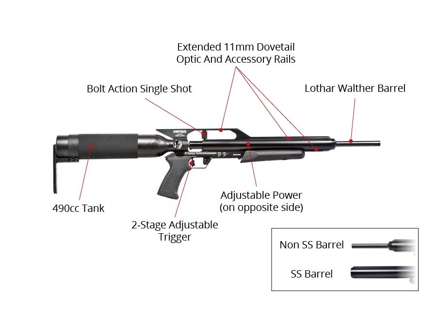 AirForce brand air rifles are considered to be some of the most advanced rifles available. Using aircraft grade aluminum alloy, space age polymers and state of the art production techniques you don’t just get a typical air rifle, you get a technologically advanced piece of machinery! With outstanding power, accuracy and advanced production techniques, AirForce air rifles will not disappoint. The AirForce Talon is the original AirForce rifle that offers one of the best combination of power, weight and balance available. The Talon uses an 18 inch Lothar Walther barrel to ensure maximum accuracy. This gives the Talon outstanding accuracy and the ability to shoot 1 inch or less groupings at 50 yards easily, once you get your iron sights or scope (both sold separately) ?zeroed? in. This makes it one of the most precise air rifles we have encountered here at Airgun Depot. AirForce Talon Features Diagram