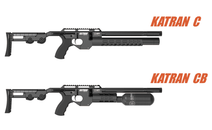 The AirMaks KATRAN Compact is a new gun model that was introduced in 2021. It is based on sturdy technology developed by AirMaks Arms, which is located in the Czech Republic. This gun offers various features such as CZ Barrels, Folding Stock, Anti-double feed, Key-Lock hand guard, aftermarket moderator, and more. The KATRAN model is available in two different bottle options – a 300cc carbon fiber bottle and a 165cc tube.