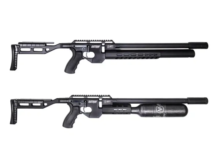 The AirMaks KATRAN is a newly released gun for 2021, built on solid technology from AirMaks Arms in the Czech Republic. It is packed with features, including CZ barrels, a folding stock, an anti-double feed, a key-lock hand guard, compatibility with aftermarket moderators, and more. The KATRAN comes in two bottle options: a 480cc carbon fiber bottle or a 200cc tube.