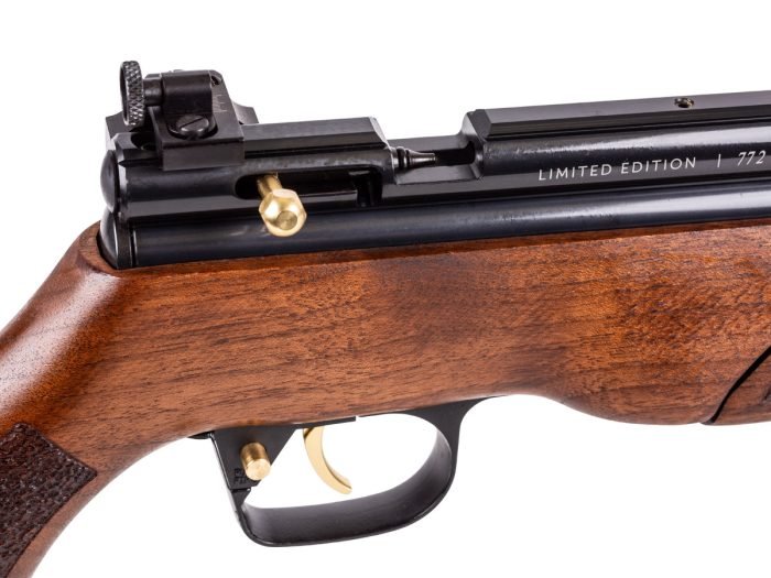 This limited edition features a brilliant Turkish Walnut stock with embedded metal 100 Year badge and is 1 of only 2,023 made. It also features a steel breech, which holds a peep sight, but can allow for a scope or red dot to be added quickly.