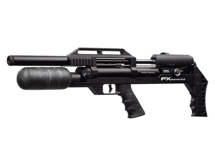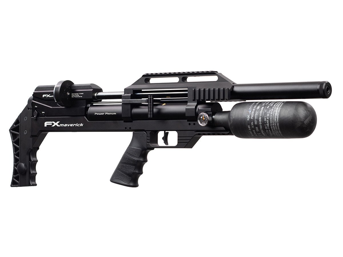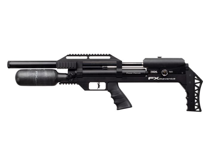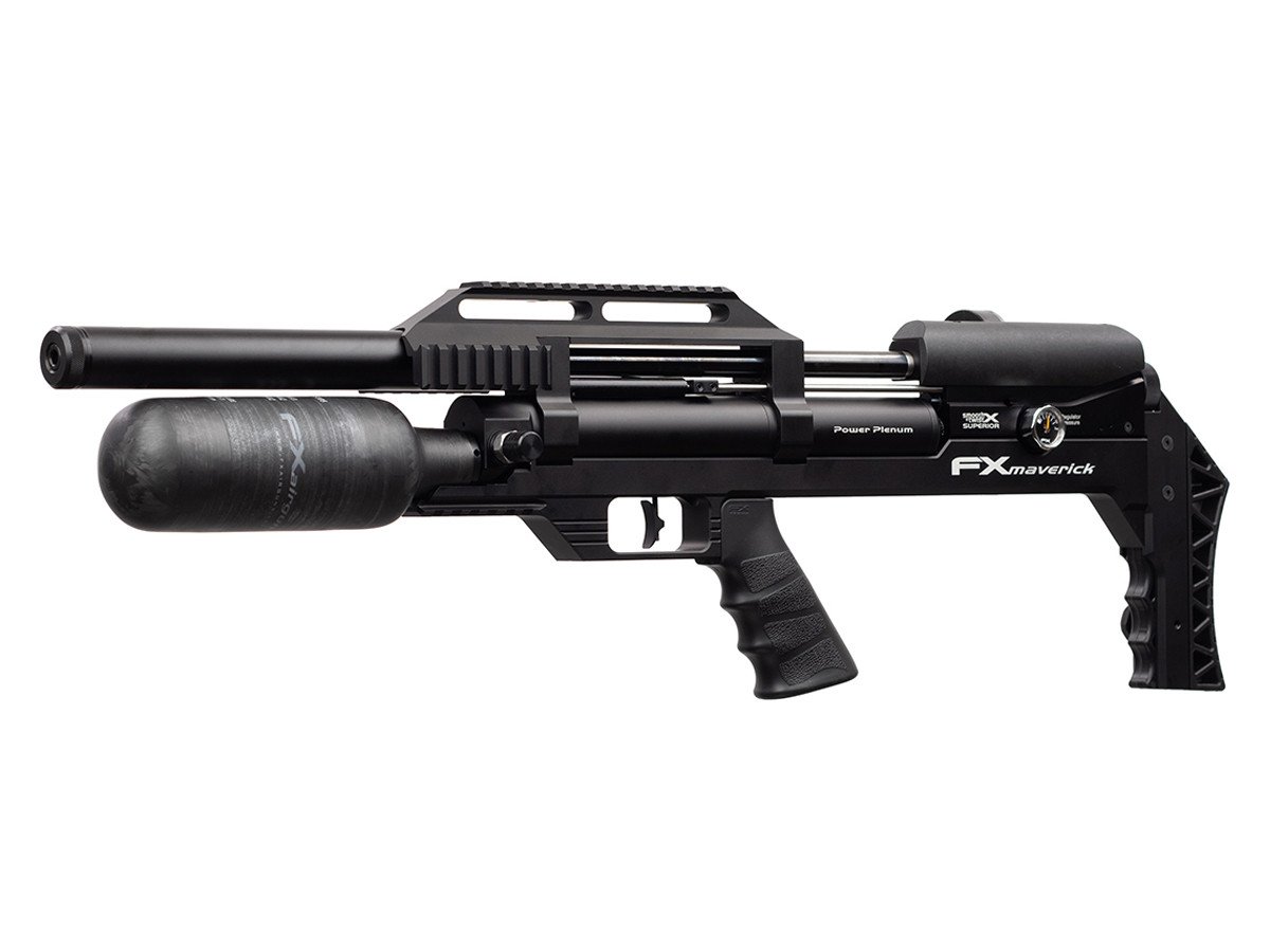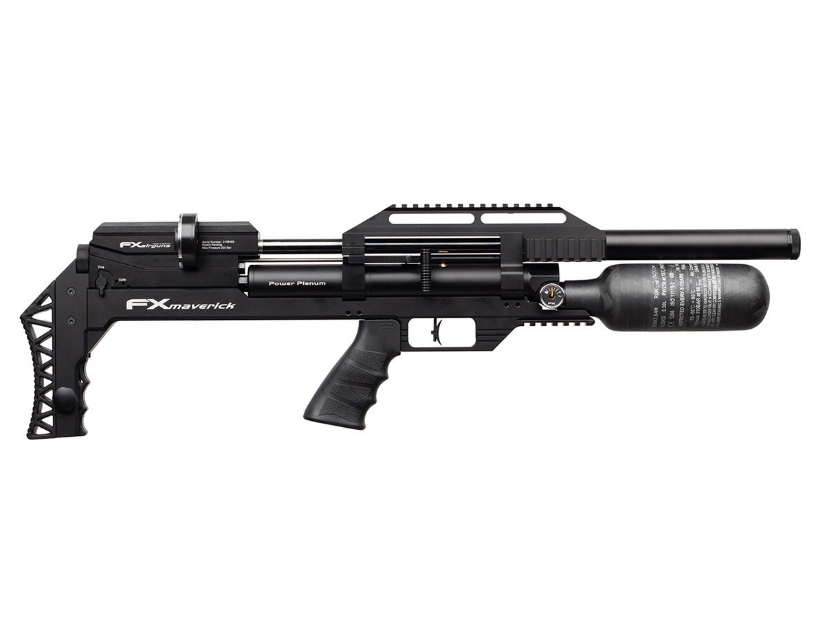 • Weight: 6.35 lbs.The FX Maverick Compact features even more revolutionary technology that pushes the envelope of what you can do with an airgun. The designers at FX decided to focus on how to improve performance in general, and specifically when shooting the increasingly popular heavier pellets and slugs. This model is shorter and weighs less than the other versions of the Maverick, so it’s easier for you to maneuver in the field but still gives you the same upgrades and innovations. The biggest new features everyone will be talking about are the dual externally adjustable AMP regulators and the larger 89cc power plenum, which is the largest FX has ever put on an airgun. The regulators work together, with the first regulator taking some of the strain off the second regulator to give you smooth, powerful, and consistent shots. All of that new power from the larger plenum is enabled by reworked ports and valves for consistent strength, and then channeled into the legendary Superior Smooth Twist X (STX) barrel and liner system that can be customized for the ammo and shooting type you want. The rifle also gives you the features you love from FX, like dual pressure gauges, a 2 stage adjustable match trigger, and the rear external power adjuster. With the Maverick, you get a tactical body with an FX textured AR grip, all new FX buttpad, and the possibility of swapping in aftermarket parts for extra customization. The 3 Picatinny accessory rails let you add lights, lasers, or bipods, and the Picatinny scope rail on top has a 20 MOA angle built in to give you better long distance accuracy. If you’re ready for an air rifle designed to maximize accuracy and portability with an improved power plenum and two regulators for smooth shooting, get an FX Maverick Compact from Airgun Depot now.