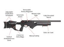The Barrage semi-auto PCP air rifle from Hatsan is ready to throw lead down range just as fast as you can pull the trigger. This awesome rifle, along with its bullpup brother the Bullmaster, are some of the first truly accessible semi-auto PCP air rifles on the market. Sure, they have been done before, but what sets the Hatsan rifles apart is A) the price point and B) the availability. Hatsan have really listened to their customers to bring semi-auto PCP’s into the scope of mainstream airgunning. The Hatsan Barrage air rifle features a large 500cc air reservoir to keep you shooting longer and spend less time filling your rifle. Its semi-auto action uses rotary magazines available in 14 shot capacity in .177 and 12 shot capacity in .22. Each rifle come with 3 magazines and 2 on board storage slots so you can easily carry extra mags with you into the field. The rifle’s stock is made of high impact polymer that is both rugged and weatherproof and features a non slip texture that makes this rifle great to hold in the hand. All metal surfaces are finished in black and add to the futuristic looks of the rifle. Wielding the Barrage is like handling no other rifle, between its fast firing action and sheer size you know this thing means business. At the core of the Barrage is Hatsans gas operated semi-auto firing system. Unlike mechanical or electronic semi-auto systems the Hatsan uses gasses recycled from the firing process to cycle the action. This results in reliable semi-auto fire with a smooth and crisp trigger pull and extremely fast follow up shots. Get ready to go through pellets like they are going out of style with the Hatsan Barrage!