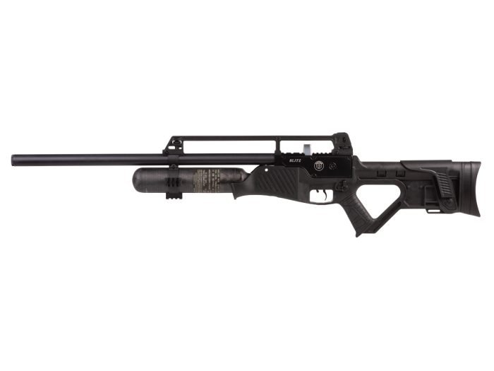 If full auto isn’t enough for you, the Blitz has more in store as well. Use the included carry handle with adjustable open sights or remove it to add a scope on the combo 11mm dovetail and 22mm Weaver optics rail. If you need more, the Blitz has 3 Picatinny accessory rails on the sides and bottom of the bottle for attaching things like a bipod, laser, or flashlight. Flip the Hatsan Blitz over and you’ll see the color coded manometer (yellow-green-red) on the bottom ahead of the trigger guard that lets you know if it’s under-pressure, optimal, or overfilled. You’ll also find fitted sling mounts, in case you did remove that carry handle on top to add a scope. If you want the power of a PCP air rifle and the excitement of full automatic, there’s literally only one airgun for you: the Hatsan Blitz.