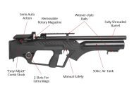 Hatsan has answered the call for a semi-auto bullpup air rifle in a big way! The Hatsan Bullmaster air rifle looks like it came straight off the silver screen or the pages of a sci-fi novel. This beast of an air rifle is available in both .177 and .22 caliber, features rotary magazines for quick reloading, a 500cc on board air tank, and Hatsans unique gas operated semi-auto action. If youre looking for a gun that can fire as fast as you can pull the trigger, youve found your match! The Hatsan gas operated semi-auto system is what really sets the Bullmaster apart from other attempts made at semi auto air rifles using electronic or mechanical actions. By using recycled gasses from the firing cycle the Hatsan Bullmaster is able to obtain both quick follow up shots as well as achieve a smooth trigger pull making this rifle one of the fastest shooting on the market. The Bullmaster also features a rugged polymer stock with an adjustable cheek pad and onboard magazine storage so you can easily carry extra ammo. Speaking of magazines each Bullmaster rifle comes with 3 included mags to keep you shooting. The rotary magazines are available in 14 shot capacity in .177 and 12 shot capacity in .22 caliber. The stock also has magazine caddies to store your two extra mags. Perfect for hunting or fast action plinking, the Bullmaster bullpup ushers in a whole new experience to airgunning, and while it may not be the first semi-auto to the market, we think that for the price it certainly is one of the best. Make sure to add a few more magazines and a whole lot of pellets to your order, this gun is hungry! Hatsan Bullmaster Features: