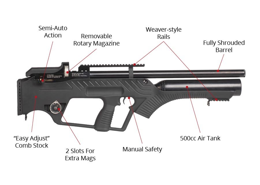 Semi-auto action pre-charged pneumatic (PCP) bullpup air rifle