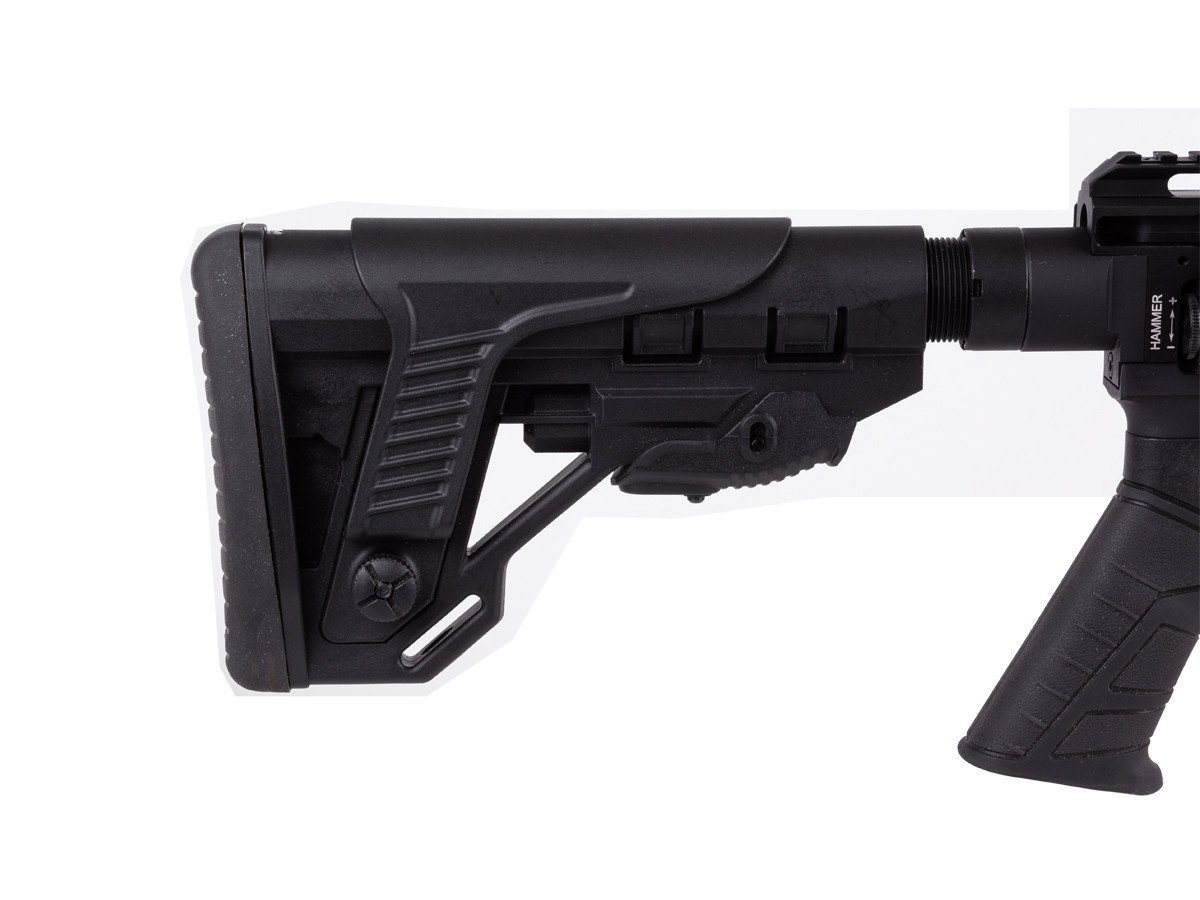 You can also adjust the blade of the 2 stage Quattro trigger vertically and horizontally, and you can change the trigger pull weight, travel, and engagement so you get the exact trigger pull you want for the ultimate in accuracy and feel. The rifle features a telescopic tactical stock for an adjustable fit, and the cheek rest adjusts for elevation, plus there’s a textured pistol grip and a rubber buttpad, so you get a stable grip and hold.