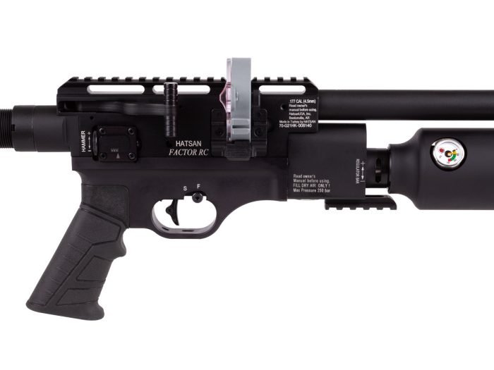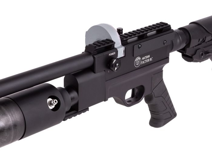 The Hatsan Factor RC is an air rifle that gives you tactical features and looks, plus a host of flexible features including an externally adjustable regulator for consistent and repeatable performance. Reaching speeds up to 1010 fps in .177, 1000 fps in .22, and 900 fps in .25, it provides you with plenty of accuracy and power for both target shooting and small game hunting.
