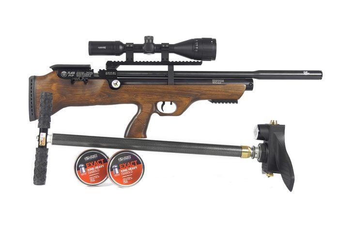 The Hatsan Flashpup has quickly become one of the most popular bullpups on the market because of its perfect combination of light weight, power and quietness. The Flashpup was designed for hunting. Being a bullpup, it is compact enough for hunting in the thickest brush, and it is light enough to carry all day. The Quiet Energy (QE) Sound Suppression keeps the noise down so you wonâ™t spook your quarry or annoy your neighbors! Putting out more power in .177 than most of its competition puts out in .22, the Flashpup is capable of taking down small game and some predators. The Flashpup is available in .177, .22, and .25, calibers, but for this combo we chose .25 cal for its versatility. With projectiles ranging in weight from 16.54 grains up to 33.94 grains and even heavier, you will be able to find an option that fits whatever need you have, whether it be taking out pests in the backyard, hunting small game and predators, or ringing steel out to 100 yards or more.