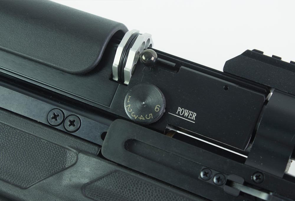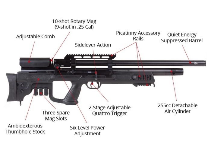 The Hatsan Gladius PCP bullpup combines Hatsans reputation for reliability with a compact bullpup package. The Gladius bullpup features a synthetic stock with all the right options that really makes this bullpup standout including adjustable comb & butt pad, onboard storage for up to 3 extra magazines (which are included), a side lever for smooth cocking action, ambidextrous thumbhole stock, scope rail and three accessory rails on forend, the excellent Quattro trigger and a fully shrouded QuietEnergy barrel to keeps things extra quiet. The Gladius also includes a brand new feature not seen before on a Hatsan PCP air rifle, Adjustable power settings. With a dial located next to the magazine, you can select one of 6 power settings to fine tune your rifles velocity and energy output based on your situation. Raise it to full power for hunting medium game, or dial it low for backyard blinking so you don’t blow through your backstop (and to increase the amount of shots per fill). Hatsan Gladius Features Diagram