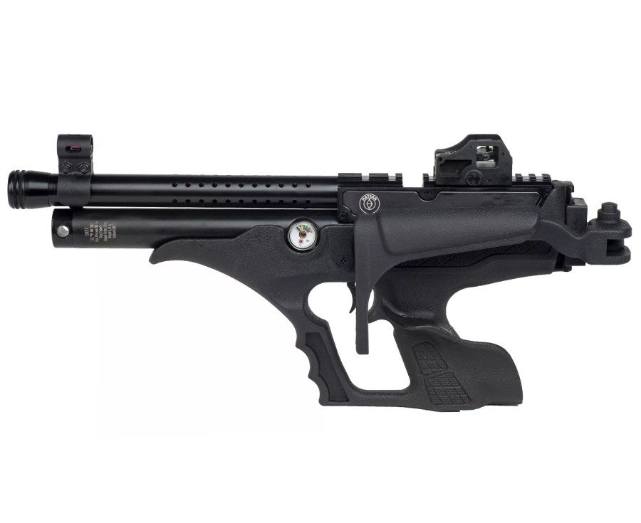 Powered by a 62cc cylinder that you can easily fill to 2900 psi/200 bar with a hand pump, this air pistol reaches speeds up to 800 fps in .177, 700 fps in .22, and 660 fps in .25. It also includes 3 magazines to take advantage of its semi auto repeating capabilities.